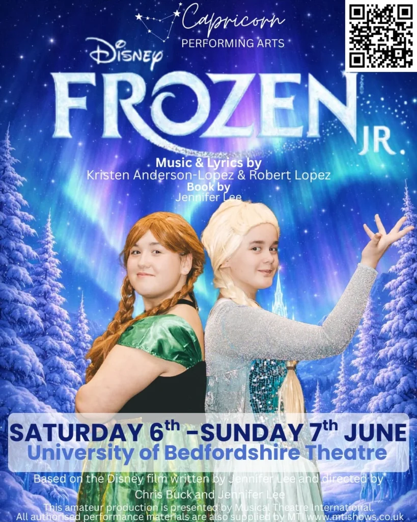 Frozen Jr. is coming to the stage with Capricorn Performing Arts in a magical family-friendly production at the University of Bedfordshire Theatre. Featuring talented young performers, this enchanting stage adaptation of the beloved Frozen follows sisters Anna and Elsa on an unforgettable journey of courage, friendship, and self-discovery.
