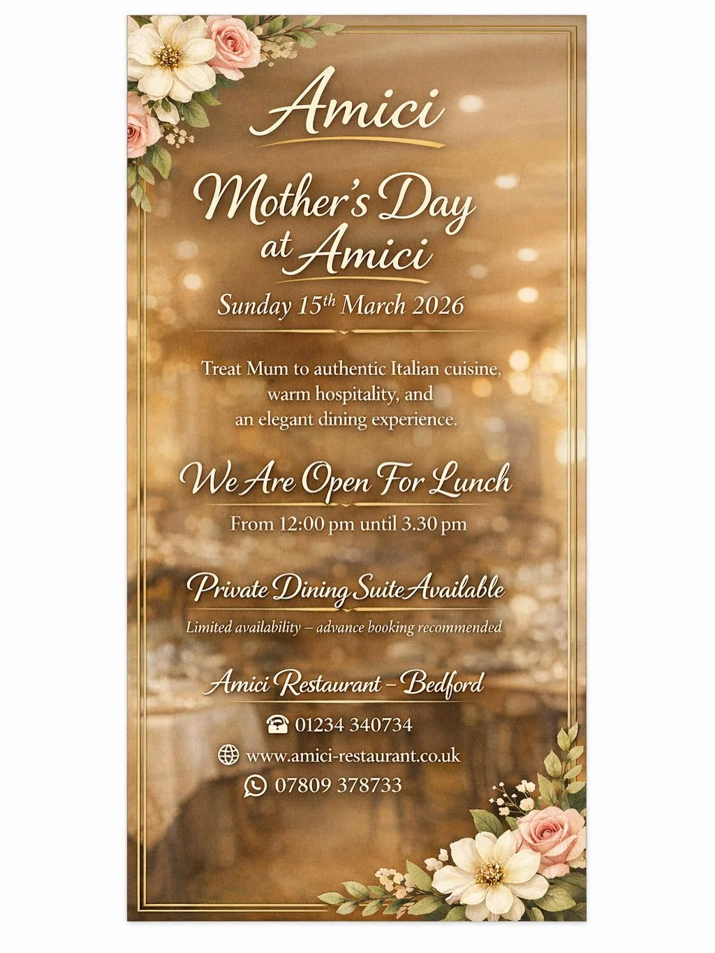 Celebrate Mother’s Day in true Italian style at Amici Restaurant in Bedford on Sunday, 15th March 2026. Guests are invited to treat Mum to an afternoon of authentic Italian cuisine, warm hospitality, and a refined dining experience in a beautifully welcoming setting.