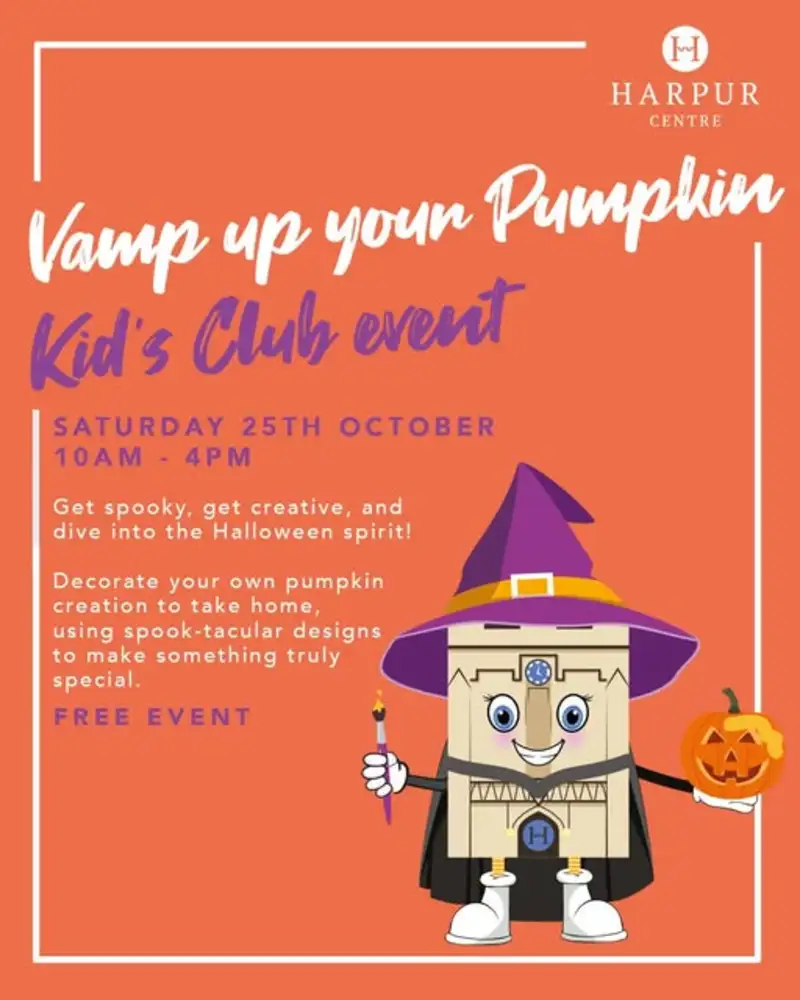Get into the Halloween spirit at the Harpur Centre with the Vamp Up Your Pumpkin Kid’s Club on Saturday 25th October 2025, from 10am to 4pm.