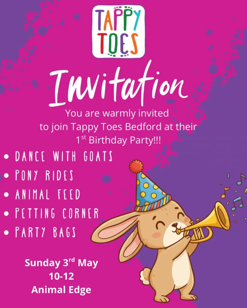You are warmly invited to celebrate the 1st birthday of Tappy Toes Bedford on Sunday 3rd May from 10am to 12pm at Animal Edge.