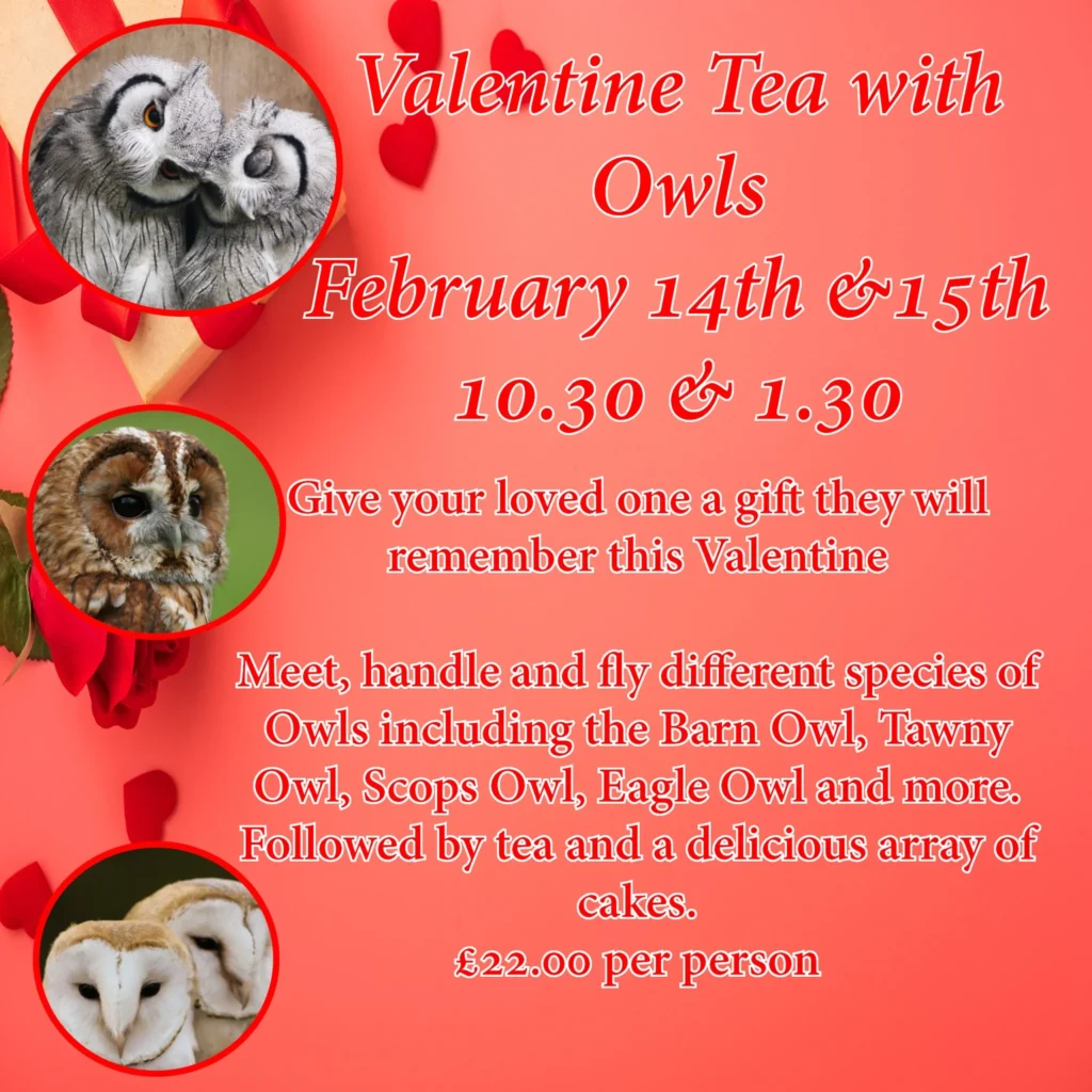 This Valentine’s Day, swap the usual plans for something a little more memorable with our Valentine Tea & Owls experience. Spend a magical hour up close with a beautiful selection of owls, including Barn Owls, Tawny Owls, Eagle Owls, Scops Owls and more.