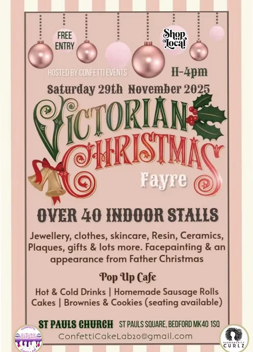 Join the festive fun at the Victorian Christmas Fayre on Saturday 29th November 2025, taking place from 11am–4pm at St Paul’s Church in Bedford. This community event offers free entry and features over 40 indoor stalls, showcasing a wide range of handmade and locally crafted items such as jewellery, clothing, skincare products, ceramics, resin pieces, plaques, gifts, and much more.