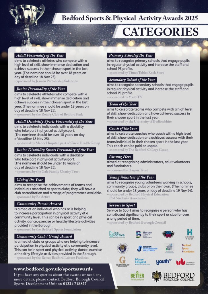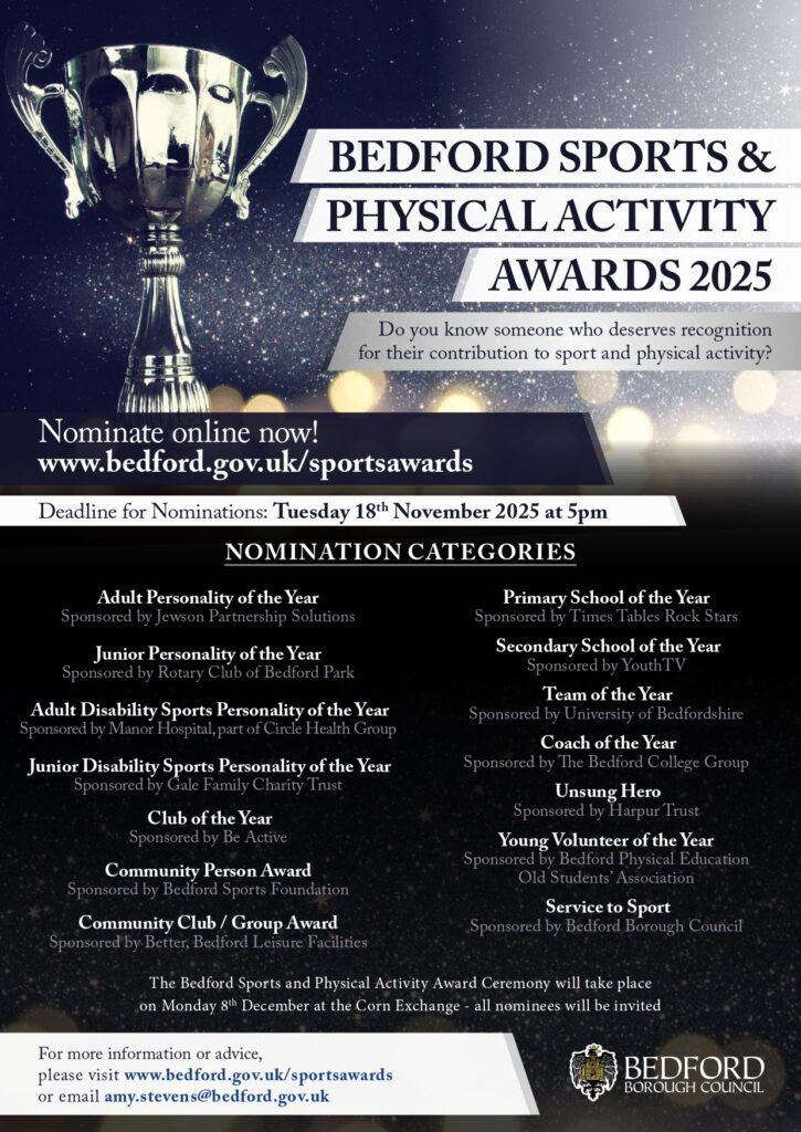 Full details about the awards and all 14 categories along with the online nomination form are available HERE or by visiting www.bedford.gov.uk/sportsawards